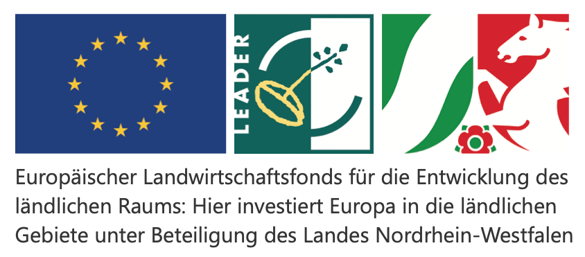 Leader, ein europäischer Strukturfonds für den ländlichen Raum, unterstützt unser 61.000 € teures Vorhaben mit 65 % der Gesamtinvestition. „LEADER“ steht für (aus dem französischen übersetzt) „Verbindung zwischen Aktionen zur Entwicklung der ländlichen Wirtschaft“. Das Programm dient der Strukturförderung und wird aus dem Europäischen Landwirtschaftsfonds für die Entwicklung des ländlichen Raums (ELER) finanziert. Das Land Nordrhein-Westfalen stellt in dieser Förderperiode zu den EU-Mitteln ergänzend Landesmittel bereit. Ziel der Förderung ist die Unterstützung einer eigenständigen und nachhaltigen Regionalentwicklung.